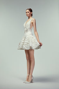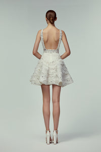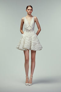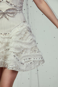 Look 8 celebrates playful elegance with a touch of sparkle, where every detail is crafted to catch the light and movement. The short V neckline dress features a fully beaded skirt, enhanced with tulle pleats, soft ruching, and buttons down the back. It is paired with an embroidered detachable wing veil, designed with a V-cut at the center fold, adding a sense of lightness and dynamic shape to the silhouette.
