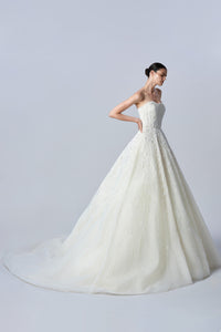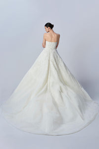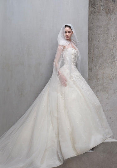 Look 5 celebrates ethereal sophistication. The strapless ballgown is fully embroidered and paired with an embroidered cape, creating a vision of luminous layering where each detail enhances the gown’s fluid majesty.