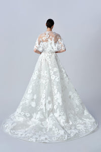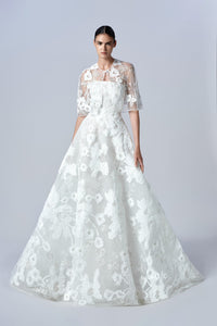 Look 7 captures the poetry of lightness. The strapless tulle A-line gown is embroidered with lace floral motifs, forming a delicate composition of texture and transparency that moves with effortless fluidity.