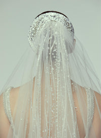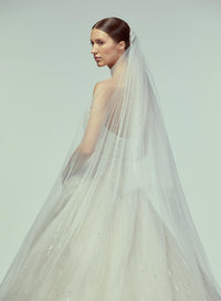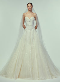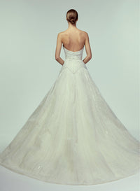 Look 15 unveils a layered elegance, where delicate textures and modern embellishments flow seamlessly into sculpted romance. The strapless tulle gown features a dropped waist and sweetheart neckline, fully embroidered and accented with delicate tulle ruching that enhances its sculpted silhouette. A fully beaded crescent-shaped headpiece completes the look, adorned with geometric sequins, intricate beaded embroidery, and sheer tulle inserts that add lightness and dimension to the overall composition.