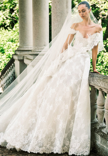 Look 5 captures a delicate balance between structure and softness, where every thread traces a quiet rhythm. The off-the-shoulder ballgown features a sweetheart neckline and is crafted in silk thread lace with a floral motif arranged in a diamond pattern. A scalloped hem finishes the silhouette with refined grace—a gown suspended in timeless beauty and gentle movement. The look is complemented by a seamless tulle veil with comb, finished with handstitched flower guipure and a delicate lace eyelash trim along the edge.