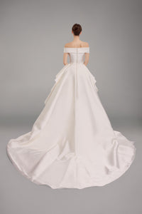 Look 14 evokes a fluid study in contrast, where sculptural lines meet weightless motion. The off-the-shoulder ivory dress is crafted in draped silk Mikado, featuring a high slit, small train, and a detachable overskirt with tiered ruffles that adds volume and dramatic transformation to the sleek silhouette.