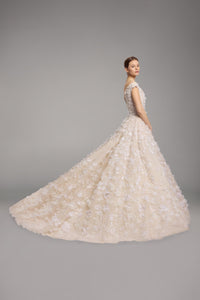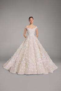 Look 16 evokes a blooming silhouette in motion, where light dances across every petal and fold. The off-the-shoulder gown is embroidered with sequins and 3D organza flower appliqués, with an open back that adds softness to the structured form. A Mikado belt defines the waist, enhancing the gown’s romantic, sculpted volume.