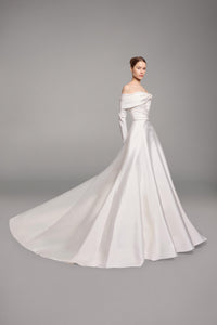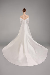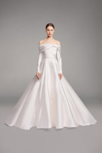 Look 17 evokes the purity of line and form, where structure is softened by fluid draping. The strapless silk A-line Mikado gown is paired with a long-sleeved draped Mikado bolero, creating a harmonious balance between architectural simplicity and graceful movement.
