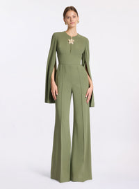 This green viscose jumpsuit features a metal flower brooch, inspired by Elie Saab’s vision of modern elegance. Its fitted bodice, round neckline, long slit sleeves, and flared pants create a sleek and sophisticated silhouette. Pair the viscose jumpsuit with Elie Saab’s leather sandals for a chic look.