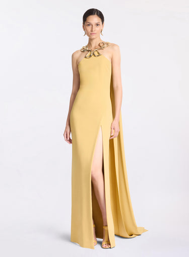 This yellow cady dress is an elegant evening design that combines sharp structure with fluid detailing. It features a metallic monogram necklace at the halter neckline, draped trails at the back, a fit-and-flare silhouette, and a high slit on the left leg. Style the halter dress with Elie Saab’s leather platform sandals for a refined finish.
