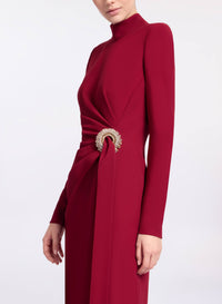 Crystal embellishments bring luminous detail to this asymmetrical, draped midi dress in Luscious Red. Designed with a high neckline and long sleeves, the silhouette flows into a straight skirt with a slit on the left leg. Bold yet elegant, the design makes a sophisticated statement for cocktail occasions.