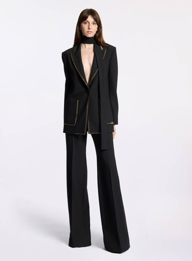 This black crepe blazer draws from the timeless sophistication of Italian style, reflecting Elie Saab’s vision for the Resort 2025 collection. Crafted in wool, it features a structured silhouette enhanced by stud embellishments along the lapel and patch pockets, and sharp shoulders. Style the embellished blazer with the matching pants and complementary scarf for a polished look.