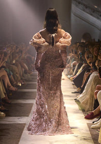 Look 15 embodies tenderness refined by opulence. The off-the-shoulder sheath gown in carnation pink features puffed sleeves and embroidered three-dimensional chiffon flowers. Embellished with tone-on-tone crystals and pearls, the gown radiates ethereal allure in a reign of grace and gentle defiance over La Nouvelle Cour.