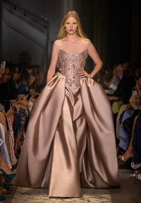 Look 37 embodies opulence reimagined. The ball gown in rosewood duchess satin features a corseted bodice fully embroidered with tone-on-tone crystals. A gathered 'panier' effect skirt flows into a long train, transforming structure into spectacle, elegance into power.