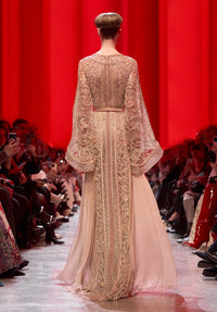 Look 25 channels opulent grace through rich craftsmanship and flowing form. The caftan dress in golden rose embroidered silk tulle features a plunging neckline and long, fluid sleeves that echo timeless elegance. Andalusian motifs in gold thread and tone-on-tone fine beading shimmer delicately, conjuring the splendor of hidden palaces and desert dusk.