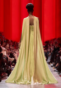 Look 30 embodies luminous minimalism with bold freshness. The strapless sheath dress in finely draped lime green lamé silk features a high slit, offering fluid movement and a confident silhouette. Its gleaming texture adds a touch of modern radiance to the streamlined design.