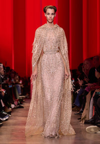 Look 39 embodies the ethereal elegance of the collection through radiant detail and refined structure. The long nude silk tulle dress is inlaid with white jasmine crystals and silver thread, creating a luminous effect. An accompanying cape, embellished with embroidered fringe, adds a soft, sweeping finish to the look.