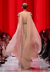 Look 60 evokes the quiet mystique of twilight over the medina. The grey chiffon sheath dress features a sweetheart neckline, delicate cap sleeves, and an open back, balanced by a soft, flowing stole. Openwork embroidery in silver silk thread shimmers with tone-on-tone crystals, capturing the ethereal elegance of a fading desert breeze.