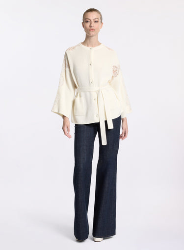 This off-white knit cardigan showcases Elie Saab’s approach to relaxed sophistication, blending softness with subtle structure. Crafted in cotton, it features patch pockets, sheer lace inserts along the sleeves, and a cinched waist. Style the cotton knit cardigan with the complementary knit belt for an elegant look.