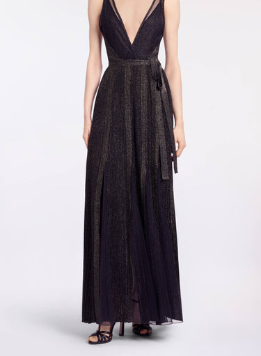 Elegant and modern, the metallic black knit midi skirt is designed with sheer tulle inserts for a striking contrast. Wear with matching bodysuit for a sleek, coordinated look.