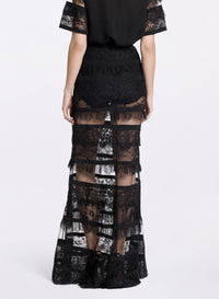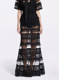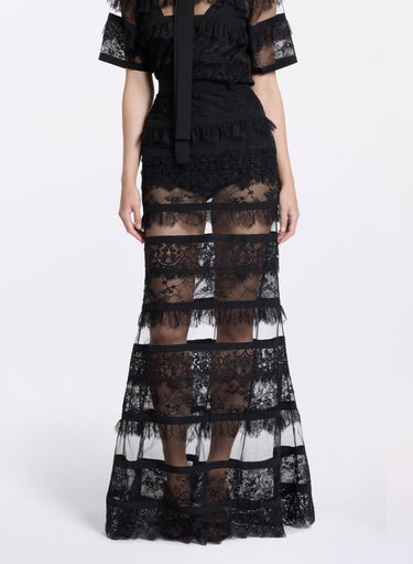 This black lace skirt is a statement piece that adds elegance to any wardrobe. It features a high-wasted mermaid silhouette enhanced by silk accents and lace inserts. Style the lace skirt with the matching lace blouse for a coordinated look.