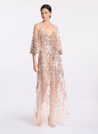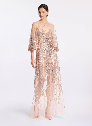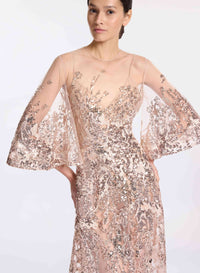 This sequin long dress is a graceful creation reflecting the collection’s theme of timeless elegance. It features flared sleeves, a fitted bust, and a flowing skirt. Style the sequin long dress with its complementary leather belt for an elegant look.