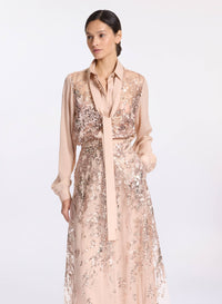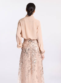 This beige silk shirt with sequin embellishments captures the collection’s theme of classic elegance. It features a classic collar, long sleeves, complementary silk camisole, and buttoned front and cuffs. Pair the long sleeve sequin shirt with the complementary silk bow and matching skirt for a complete look.