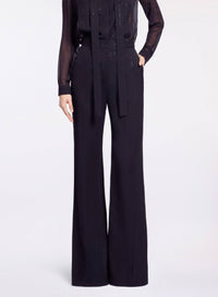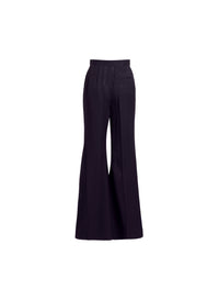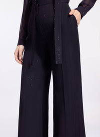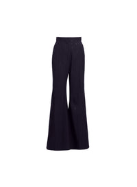 These black pinstripe pants are designed with a high-rise waist and flared silhouette, adding a tailored edge to daywear looks. Featuring front slash pockets, they pair perfectly with the matching jacket and shirt for a sharp, coordinated ensemble.