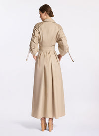 This poplin midi dress is a modern and refined style celebrating Elie Saab’s vision of elegance. Crafted in poplin cotton, it features a relaxed silhouette enhanced by a gathered waistline, drawstring sleeve details, and a flared skirt. Pair the poplin midi dress with Elie Saab’s leather sandals for a chic look.