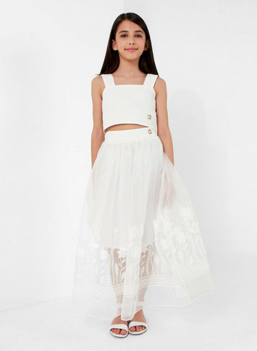 Chic and effortlessly elegant, this cream-colored embroidered organza top for kids blends sophistication with modern style. Designed with intricate textured detailing and a structured silhouette, this piece adds a touch of refinement to any special occasion look. Pair it with matching skirt for a graceful ensemble.