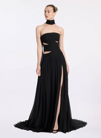 This black strapless silk dress is a contemporary and elegant design. It features cut-out details and a long gathered skirt with a high side slit. Pair the black silk dress with the complementary silk scarf for a complete look.