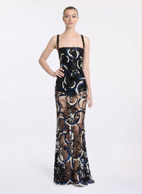 This long embroidered dress is adorned with Ellie Saab’s iconic monogram in black and white. Crafted in silk tulle, it features a mermaid silhouette enhanced by a straight neckline and a mid-open back. Pair the tulle embroidered dress with Elie Saab’s satin platform pumps for a complete look.