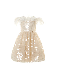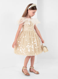 Add a touch of glamour to your little one's wardrobe with this gold sequin dress for kids. Designed with delicate sequin embellishments, feather detailing, and a voluminous skirt, this dress exudes timeless elegance. Suitable for special occasions, it creates a magical, radiant look.