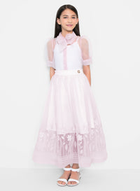 Delicate and refined, this pink-colored embroidered organza skirt designed for kids is a dreamy addition to your little one’s wardrobe. Featuring intricate floral embroidery, a soft tulle overlay, and a flowing silhouette, this skirt exudes timeless elegance. Pair it with the matching top for a graceful and polished ensemble.