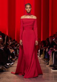 Look 57 channels the fiery spirit of Marrakesh’s midday light, where passion and elegance meet in striking harmony. The vermilion red crepe sheath dress features a long-sleeve, off-the-shoulder bodice with a soft draping effect that flows into a refined silhouette.