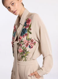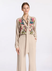 This elephant grey silk shirt presents Elie Saab’s elegant take on the classic shirt. Crafted in silk, it features floral embroidered appliques blossom across the bodice with long sleeves and buttoned cuffs. Pair the silk shirt with the complementary silk bow and silk pants for a complete look.