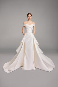Look 14 evokes a fluid study in contrast, where sculptural lines meet weightless motion. The off-the-shoulder ivory dress is crafted in draped silk Mikado, featuring a high slit, small train, and a detachable overskirt with tiered ruffles that adds volume and dramatic transformation to the sleek silhouette.