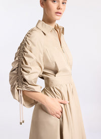 This poplin midi dress is a modern and refined style celebrating Elie Saab’s vision of elegance. Crafted in poplin cotton, it features a relaxed silhouette enhanced by a gathered waistline, drawstring sleeve details, and a flared skirt. Pair the poplin midi dress with Elie Saab’s leather sandals for a chic look.