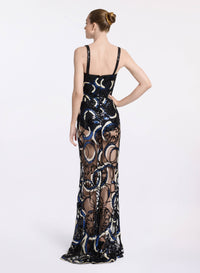 This long embroidered dress is adorned with Ellie Saab’s iconic monogram in black and white. Crafted in silk tulle, it features a mermaid silhouette enhanced by a straight neckline and a mid-open back. Pair the tulle embroidered dress with Elie Saab’s satin platform pumps for a complete look.